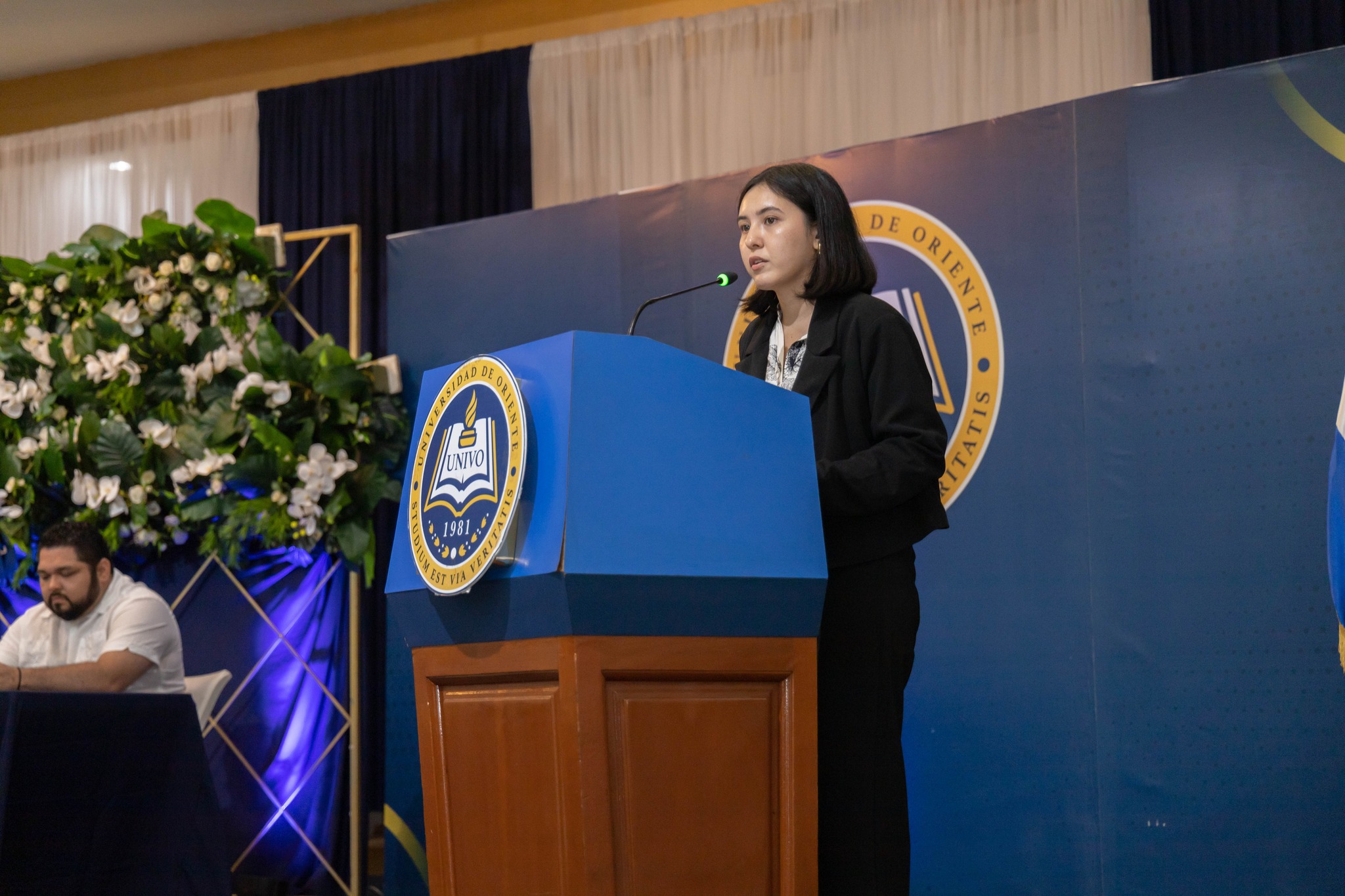 La actividad dio inicio con el saludo de bienvenida y la presentación de la mesa de honor, conformada por las máximas autoridades universitarias: el Dr. Pedro Arieta Vega, Rector de la UNIVO; el Lic. Ever Martínez, Vicerrector General; la Lic. María Luisa Sevillano, Vicerrectora Académica; y el Lic. Julio César García, Secretario General.